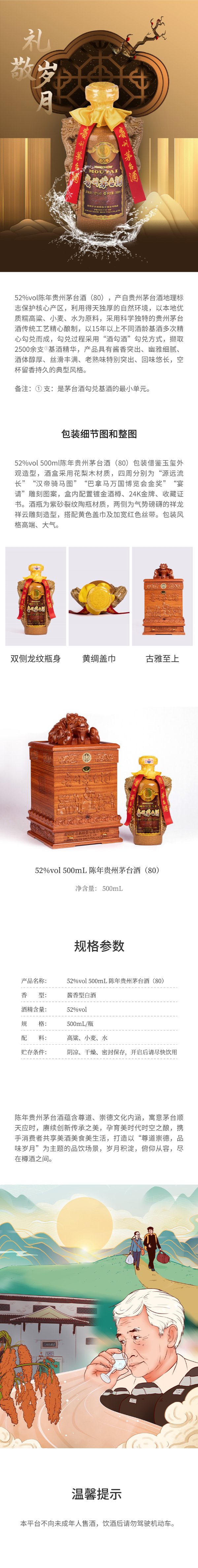 陈年贵州茅台酒(80) 类型:酱香型白酒 度数:52%vol 规格:500ml/瓶 产品介绍 上一篇:陈年贵州茅台酒 下一篇:贵州茅台酒(珍品) 相关产品 茅台迎宾酒(紫) 贵州大曲壬寅虎年 茅台王子酒(金王子) 茅台王子酒(酱香经典)